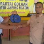 KALIANDA--Suport olahraga, Wakil Ketua DPD Angkatan Muda Partai Golkar (AMPG) Kabupaten Lampung Selatan, Setiawan, S.Pd, hibahkan alat dua...