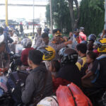 Personel Polres Lampung Selatan, Polda Lampung, membagikan minuman mineral dan snack ringan gratis kepada pemudik arus balik roda dua yang telah tiba di...