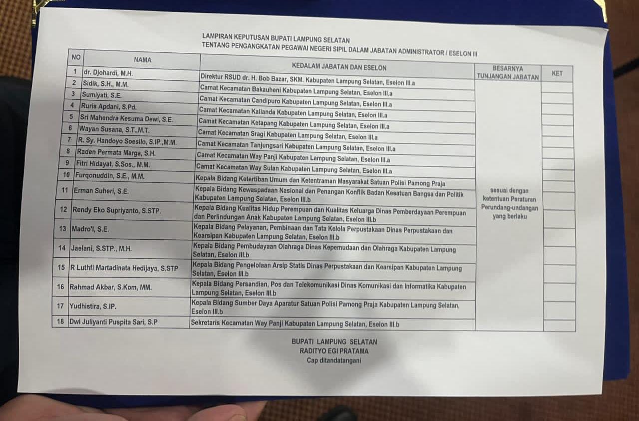 Selain 8 Camat tersebut, Bupati Egi juga melantik dr. Djohardi sebagai Direktur RSUD Bob Bazar Kalianda, serta Dwi Juliyanti Puspita Sari sebagai Sekretaris Kecamatan Way Panji, dan 8 tenaga administrator lainnya untuk mengisi sebagai Kepala Bidang di sejumlah perangkat daerah Pemkab Lamsel.