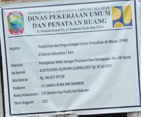 Jenis Kegiatan Pembangunan pengelolaan dan pengembangan sistem penyediaan air minum (SPAM) yang berlokasi di dusun 2A Desa Karang Anyar Kecamatan Jati Agung Kabupaten Lampung selatan dengan Pekerjaan Peningkatan SPAM jaringan pemipaan, nomor kontrak : 41/KTR/KONS-CK/DPUPR-LS/APBD/2025 Tanggal 02Juli 2025 Pelaksana CV.Cahaya Alam Jaya Makmur waktu pekerjaan 120 hari menelan biaya Rp.546.827.037.