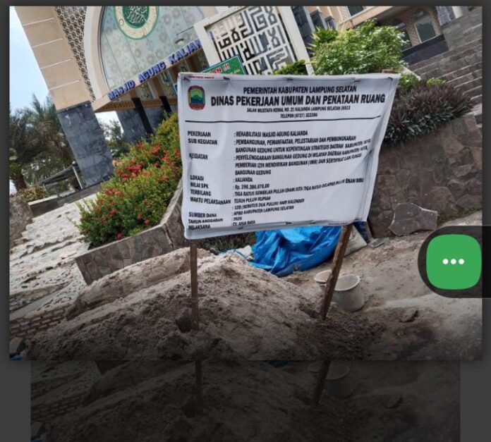 KALIANDA- Sungguh diluar dugaan sebagian besar warga masjid Agung Kalianda, kini berubah Masjid Agung Lampung Selatan. Penelusuran media ini, proyek fantastis yang bernilai mendekati angka 400 jt, itu tentang rehabilitasi masjid Agung Kalianda. Dalam proyek itu, ada empat pekerjaan kewajiban rekanan. Satu diantaranya rehap untuk lintasan jamaah disabilitas. Termasuk, rehab WC dan sebagainya.