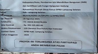 Terkait itu, aktivitas pembangunan proyek pemerintah rehab berat rumah dinas ketua DPRD Lamsel dikerjakan oleh para pekerja tampa dilengkapi peralatan K3. Pada rehab berat Rumdin Ketua Dewan itu, tertera dalam papan informasi proyek bahwa nilai proyek rehab rumdin ketua dewan itu nilainya mencapai Rp. 992, 535 ratus juta dengan kontraktor pelaksananya CV Agha Kontruksi.