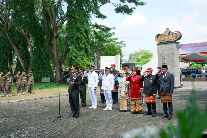 Upacara yang dipimpin langsung oleh Bupati Lampung Selatan, Radityo Egi Pratama, selaku Inspektur Upacara, berlangsung khidmat sekaligus megah. Latar belakang Menara Siger yang menjulang di tepi Selat Sunda, berpadu dengan hamparan laut biru dan langit pagi yang cerah, menjadikan prosesi sakral ini semakin berkesan.
