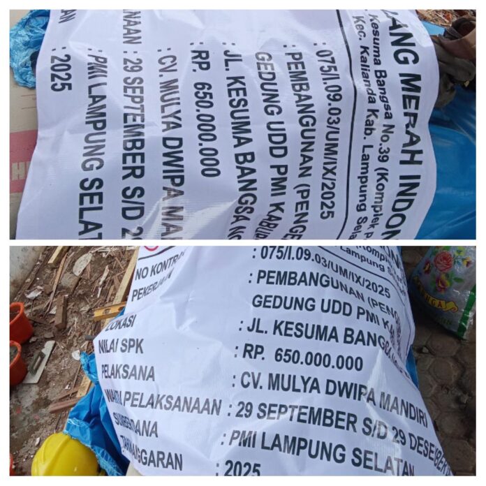Meski begitu, berdasarkan papan informasi proyek yang belum terpasang tapi masih tergeletak dilantai dan belum terpasang tapi masih digunakan untuk menutupi semen, proyek dengan nomor kontrak 075/I.09.03/UM/IX/2025, dengan jenis pekerjaan pembangunan (pengembangan) gedung UDD PMI Kabupaten Lamsel, memiliki waktu pelaksanaan dari 29 September s/d 29 Desember 2025, dengan pelaksana CV Mulya Dwipa Mandiri, dengan nilai kontrak Rp.650 juta. (asof)